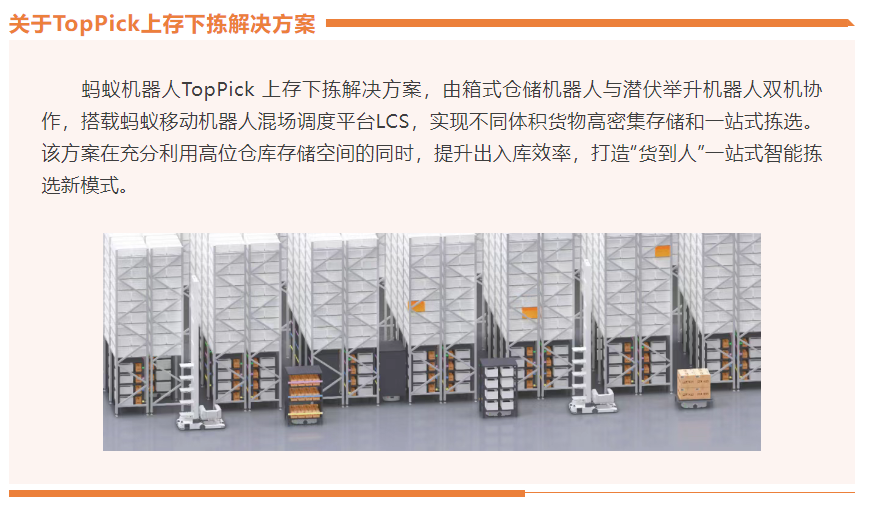 該方案將密集存儲和貨到人高效揀選合二為一,依托螞蟻機器人成熟的智能揀選算法,實現螞蟻料箱機器人和潛伏機器人協同作業,快速完成出入庫揀選,減少人工的無效走動,提高了運作柔性和空間利用率。