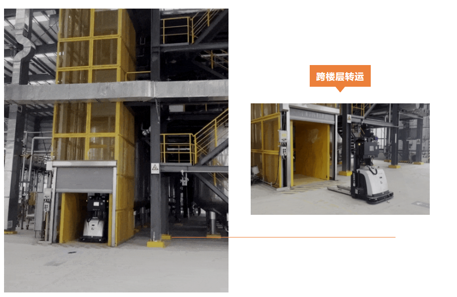 其中預熔車間和灌裝車間的AGV進行防爆改裝,AGV可以通過提升機進行跨樓層轉運,滿托盤配送線邊,以及空托盤收集返回倉庫。