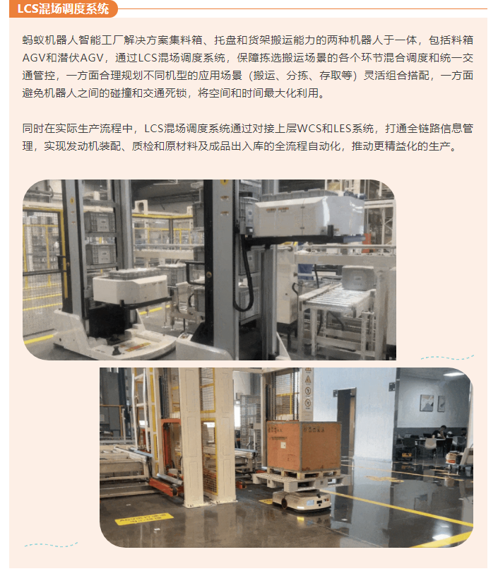 項(xiàng)目占地一萬一千多平米,覆蓋機(jī)加區(qū)、裝配區(qū)、測(cè)試區(qū)、包裝區(qū)、質(zhì)檢區(qū)和智能倉(cāng)儲(chǔ)單元,該智能工廠解決方案共引入20臺(tái)機(jī)器人以及配套軟件系統(tǒng),實(shí)現(xiàn)發(fā)動(dòng)機(jī)物料及半成品的全自動(dòng)化配送和揀選,其中包括16臺(tái)潛伏AGV和4臺(tái)料箱AGV混合調(diào)度,由螞蟻LCS混場(chǎng)調(diào)度系統(tǒng)統(tǒng)一指揮,實(shí)時(shí)分析生產(chǎn)現(xiàn)場(chǎng)物流數(shù)據(jù),動(dòng)態(tài)規(guī)劃最優(yōu)路徑,協(xié)調(diào)兩種車型的作業(yè)時(shí)序,確保潛伏AGV與料箱AGV無縫銜接、協(xié)同作業(yè)。