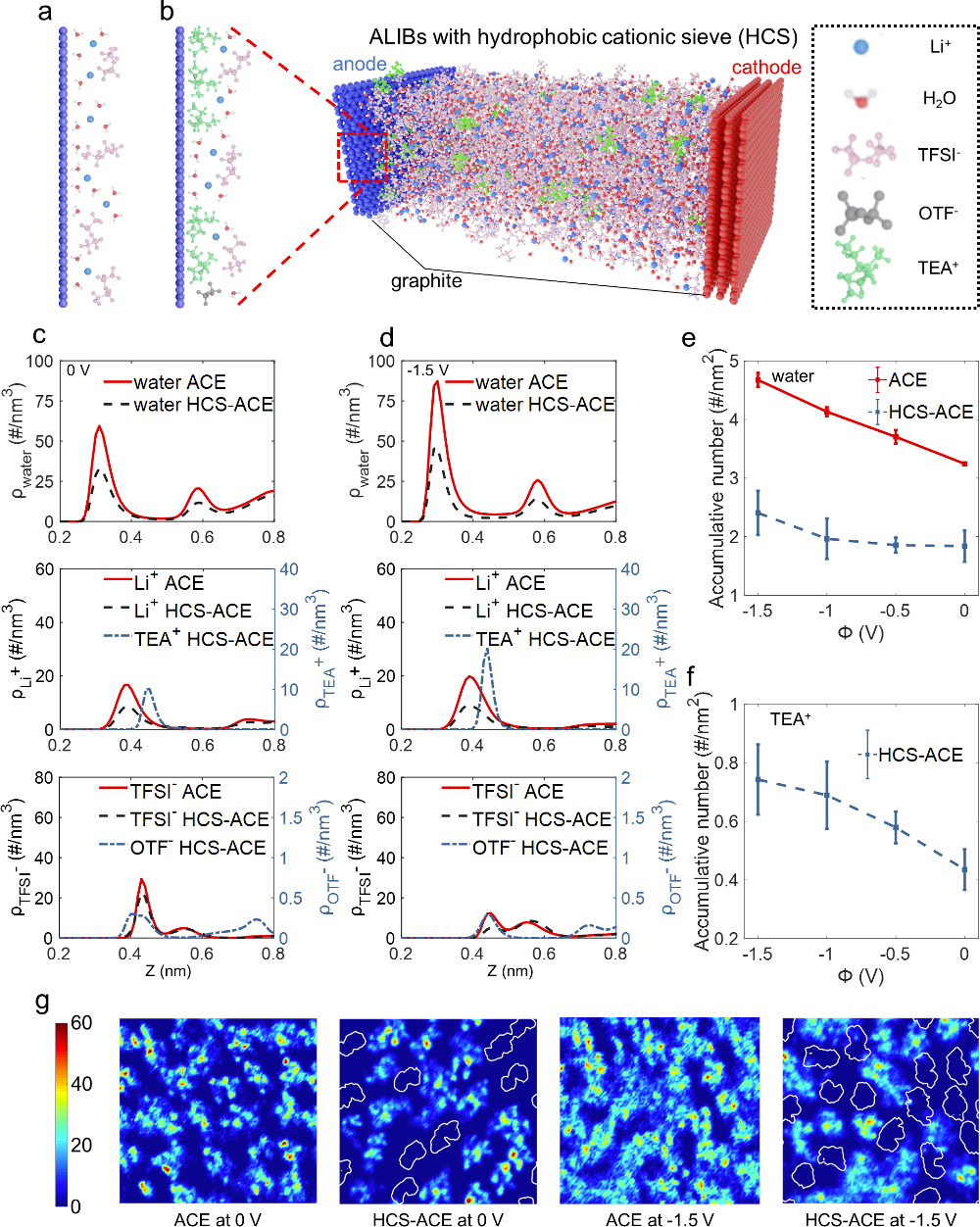 圖1. (a)沒有HCS的負極界面結構。(b)含有HCS的分子動力學模擬結果,以及含有HCS的負極界面結構。在0 V (c) 和-1.5 V(d) 時水分子(頂部),陽離子(中間),陰離子(底部)的數密度圖。(e)在HCS-ACE和ACE兩個系統中,負極界面水分子電吸附的情況。(f)在HCS-ACE系統中TEA+陽離子電吸附的情況。g)在負極界面水分子二維分布的情況,白色輪廓代表TEA+的位置。